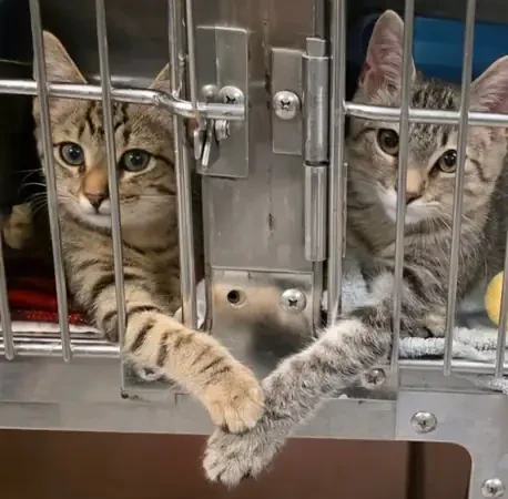 One day, Vicki walked into HSYC’s cat room to check on the kitties and noticed something that made her stop in her tracks. Colleen and another kitten named Pedro Pascal were holding paws through the bars of their kennels.