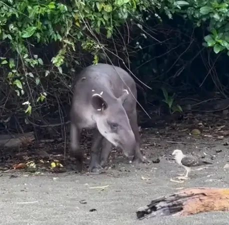 The tapir Paniagua encountered was doing just that. While enjoying the lush vegetation lining the ocean’s shore, the tapir received a visit from a caracara who seemed just as hungry.